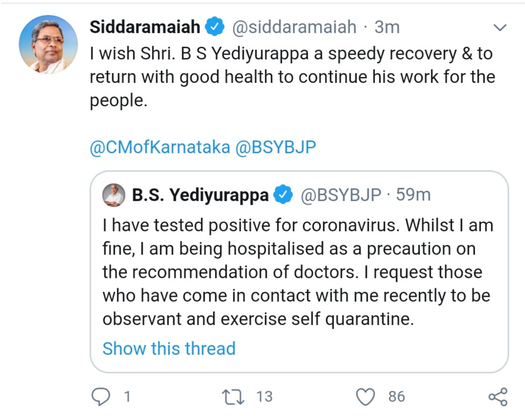 ಬೆಂಗಳೂರು (ಕರಾವಳಿ ಟೈಮ್ಸ್) : ಮುಖ್ಯಮಂತ್ರಿ ಬಿ.ಎಸ್. ಯಡಿಯೂರಪ್ಪ ಅವರು ತನಗೆ ಕೊರೋನಾ ಪಾಸಿಟಿವ್ ಎಂದು ಟ್ವಿಟರ್ ನಲ್ಲಿ ಘೋಷಿಸಿಕೊಳ್ಳುತ್ತಿದ್ದಂತೆ ವಿಪಕ್ಷ ನಾಯಕ ಸಿದ್ದರಾಮಯ್ಯ ಅವರು ಸಿಎಂ ಅವರ ಆರೋಗ್ಯಕ್ಕಾಗಿ ಹಾರೈಸಿದ್ದಾರೆ.